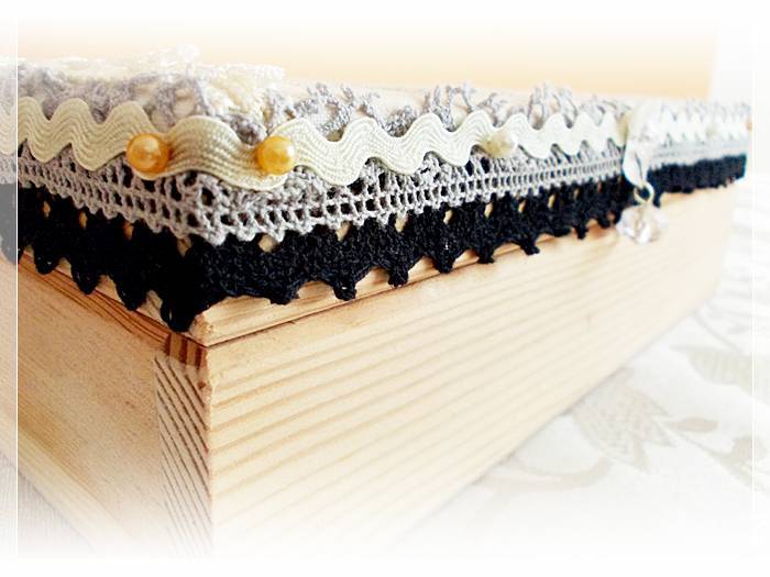 tym razem użyłam bawełnianej koronki szarej i czarnej oraz kremowej taśmy w zygzak :)